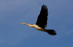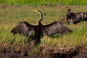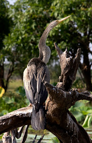 Darters dryings their wings after fishing. When they swim on the surface their whole body is often emerged with just the head sticking out... They dissappear quicly and silently into the water. Their feathers do not hold the air in them like most other water birds.