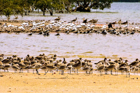 Bar-tailed Godwits, terns and Eastern Curlews. Cooloola coast. Qld. (migratory wader birds) ..resting in the RAMSAR protected area on the Fraser Coast.