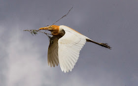 Cattle Egret with breeding plumage gathering nesting material. When they are not breeding they are all white.
