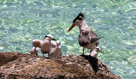 Crested Tern, and smaller Black-naped terns, Heron Island. Qld.