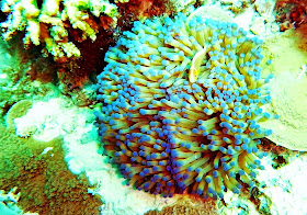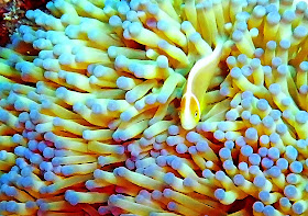 anemone and resident skunk anemone fish. these little fish live in the anemone and gain protection from it. the anemone has stinging cells that keep other fish away. the anemone fish have a protective coating on their skin to protect them making it possible for them to live in amongst the anemone